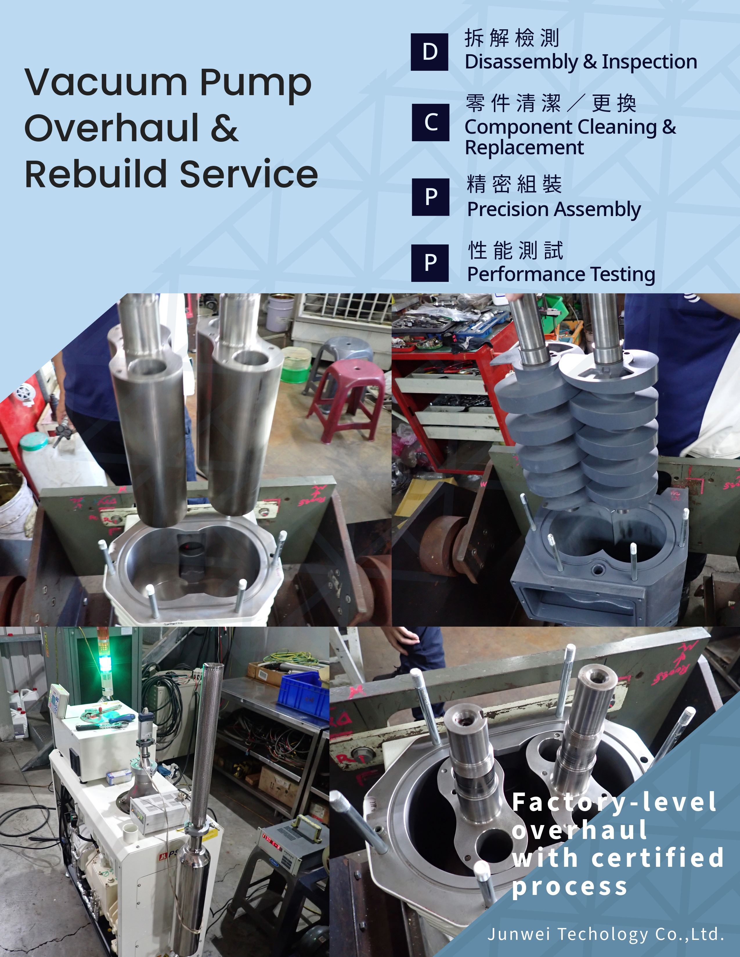 本公司提供各大品牌真空幫浦之銷售與專業維修服務,涵蓋設備翻修、性能檢測與定期保養,確保設備長期穩定運行。